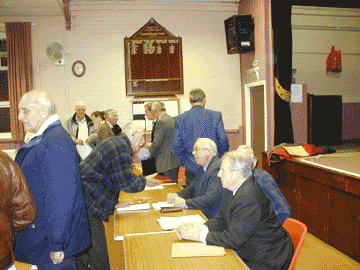 of the hall below the stage was a row of tables behind which sat our